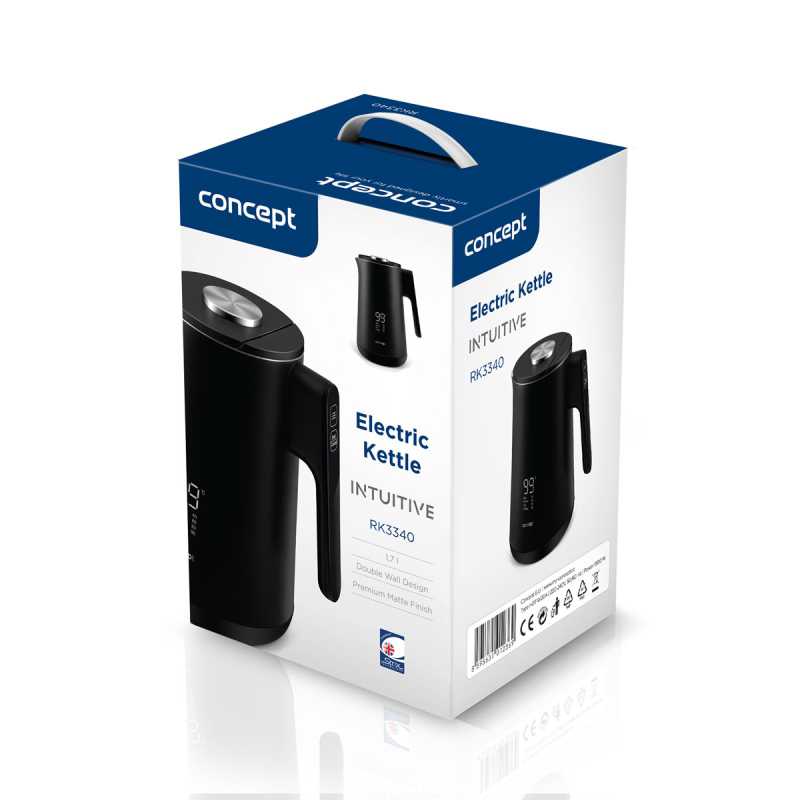 A Concept RK3340 INTUITIVE digitális vízforraló magasan kiemelkedik elegáns duplafalú kialakításával és letisztult kijelzőjével. 1,7 liter térfogattal, hőmérsékletszabályzó funkcióval és biztonságos, hűvös érintkezési felületet kínál.