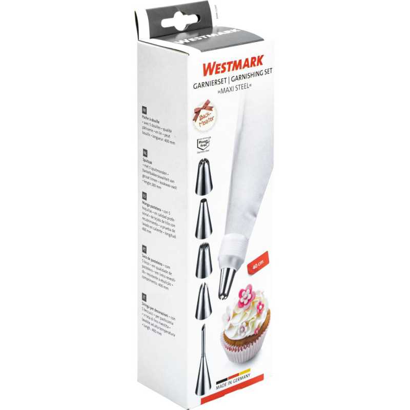 A Westmark Maxi Steel habzsák szett Ön is cukrászmesterhez méltóan díszítheti fel süteményeit. A különböző, rozsdamentes acél habcsövek könnyen felszerelhetők és segítenek a legkreatívabban feldíszíteni ízletes süteményeit, tortáit és egyéb más készítményeit. A habzsák magas, cukrászati minőségű, bevonatos pamutból készült; forralható, így rendkívül tartós.