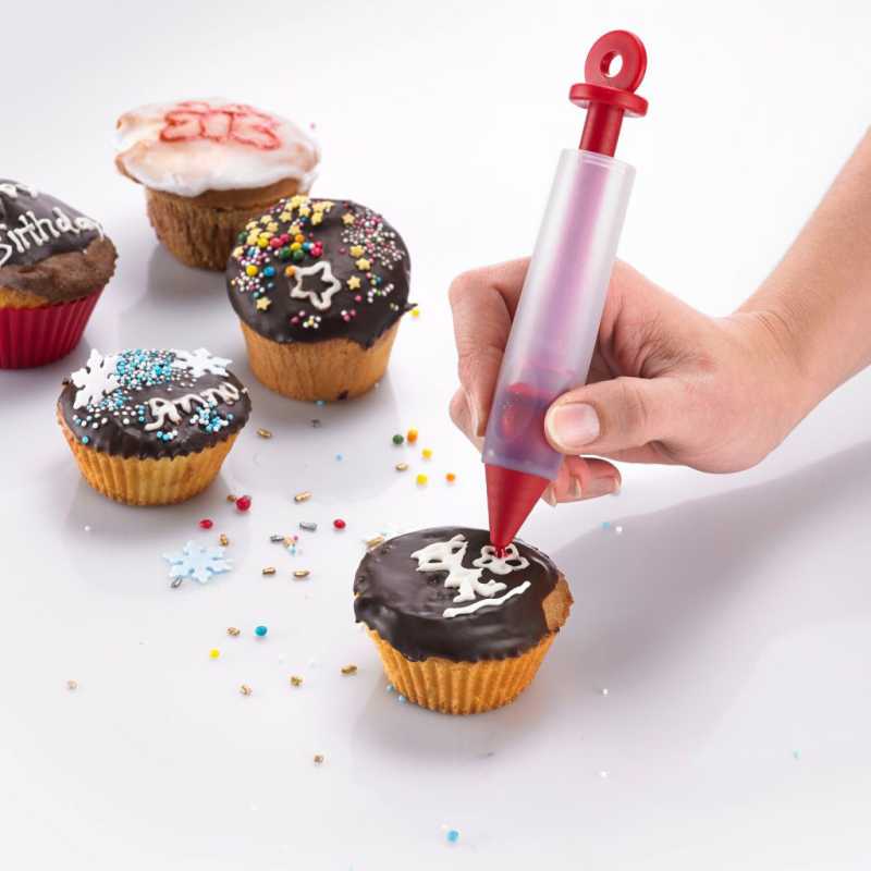 A személyesebb utolsó simításokért! Készítsen lélegzetelállító mintákat süteményeire vagy írjon egy kedves üzenetet, mondjuk „Boldog születésnapot!” vagy „Jó étvágyat!” a tányérok szélére., így a sütemények, levesek vagy más ételek még jobban fognak esni barátainak, családjának, vendégeinek. A szilikon díszítő tollal nagyszerű, stílusos díszítéseket készíthet olvasztott csokoládéval, cukormázzal vagy mártással muffinokon, desszerteken és más ételeken. Használat után a toll könnyen, mosogatógépben mosható, kompakt méretéből kifolyólag pedig helytakarékosan tárolható akár egy konyhai fiókban.