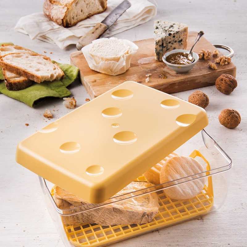 Sajt formájú 3 literes tárolódoboz, mely alkalmas egész és szeletelt sajtok egyszerű és praktikus tárolására. Kivehető ráccsal.
