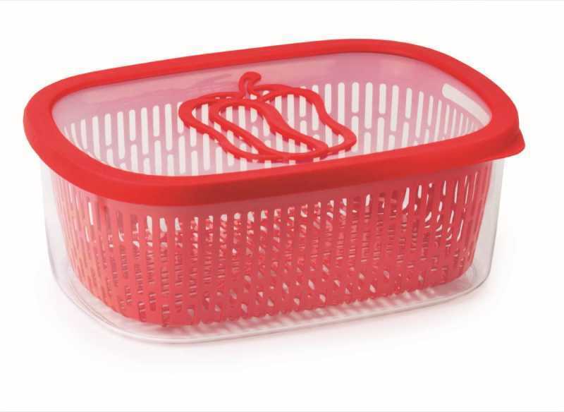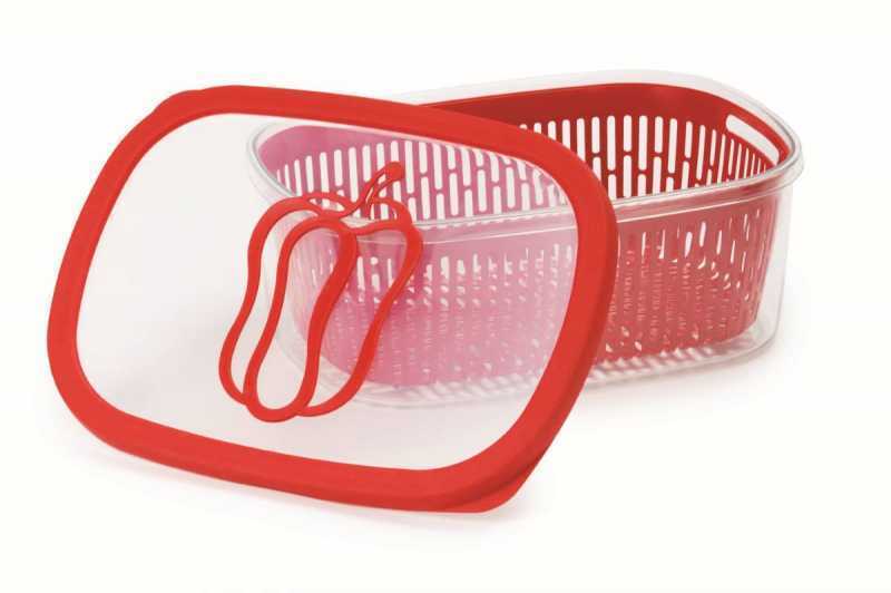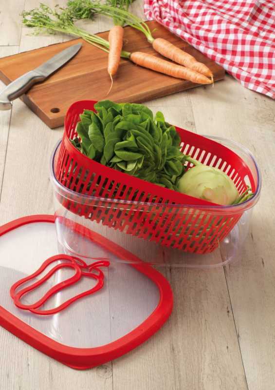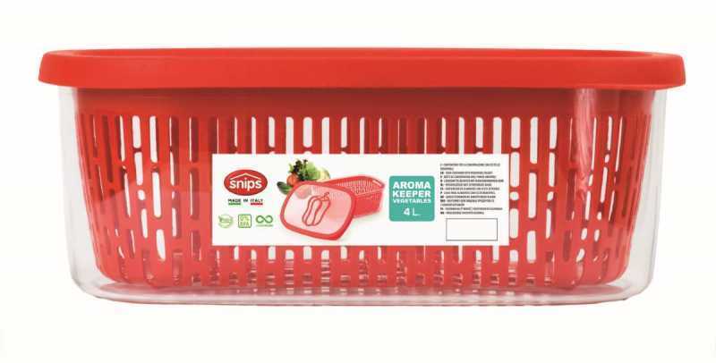 Snips 021488 műanyag zöldségtároló doboz, 4 liter, kivehető zöldségmosó kosárral és légmentesen záró tetővel. Piros színben.