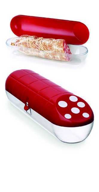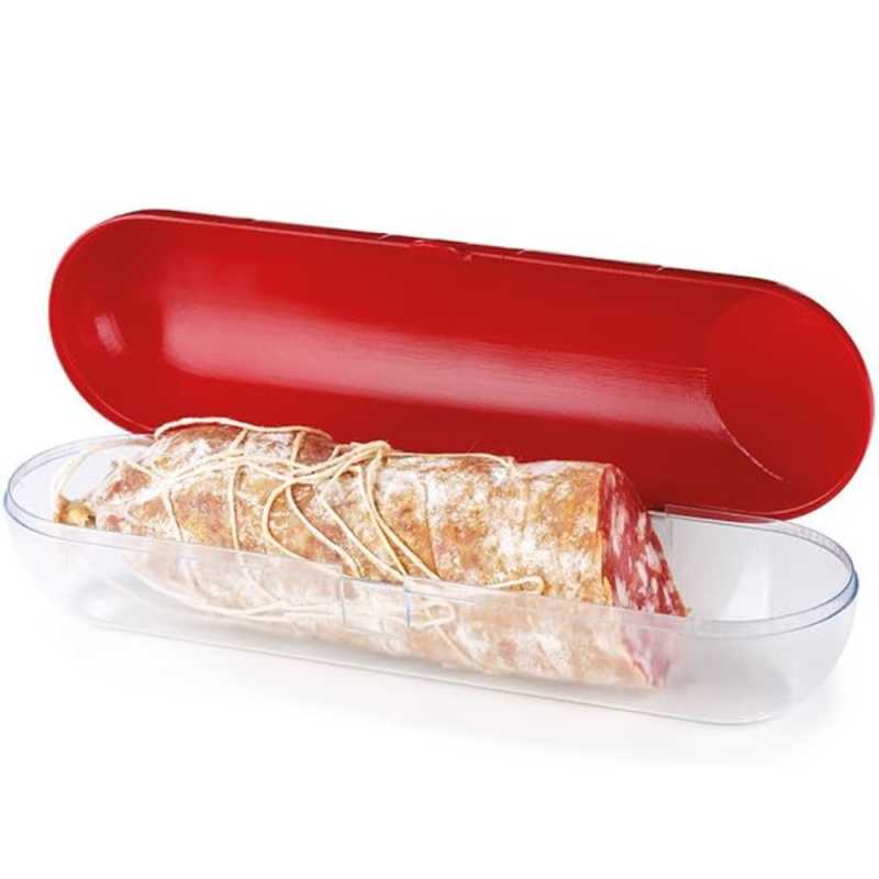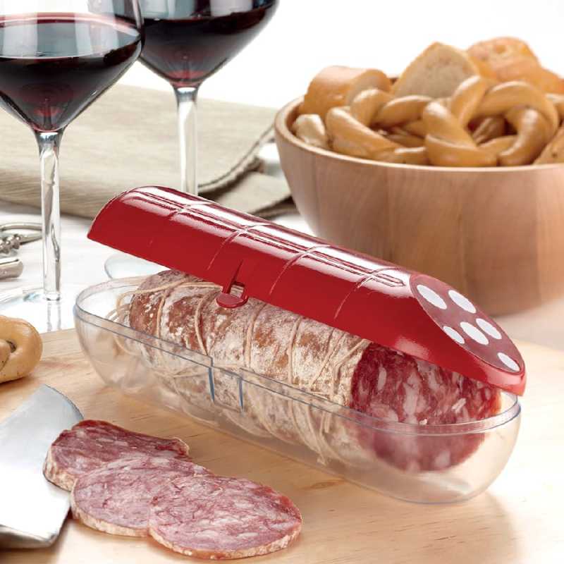 A szalámi formájú tárolódobozban praktikusan tárolhatjuk a hűtőben a szalámit és a kolbászt. Megakadályozza ételeink gyors kiszáradását és aromavesztését. A doboz egy zárófüllel elátott.
