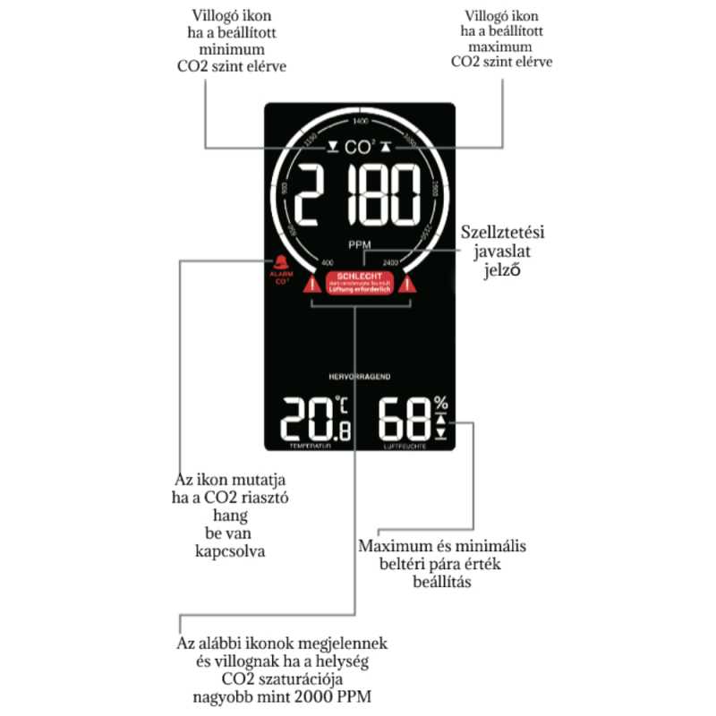 • Állítható CO2-érték riasztás opcionális riasztóhanggal.
