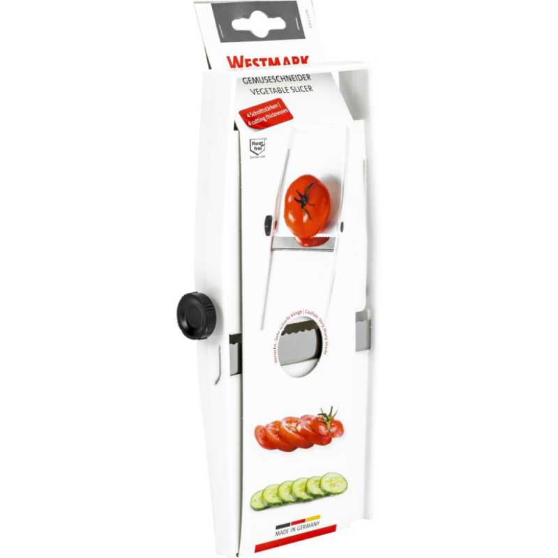 A Westmark zöldségszeletelővel könnyedén vághat burgonyát, almát, hagymát és uborkát. A rozsdamentes acélból készült, fogazott élű pengének köszönhetően még a puha gyümölcsök és zöldségek gyors és csendes szeletelése is kevés erőfeszítéssel lehetséges. A vágási vastagság 4 fokozatban könnyen állítható. A kis súlyának köszönhető jó kezelhetőség és a minden kézméretnek megfelelő nagyméretű hurok lehetővé teszi a biztonságos munkavégzést bármilyen szögben.