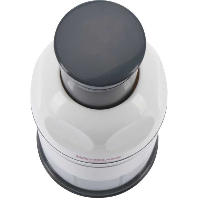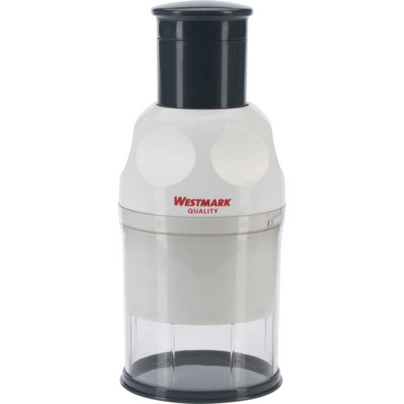 A pengék minden lenyomásnál fordulnak, így biztosítva, hogy egyenletesen vágják fel az aprítanivalót. A plusz fedélnek köszönhetően az aprító tartály akár tárolódobozként is használható. Az alsó fedő eltávolításával vágódeszkán is használható az aprító.