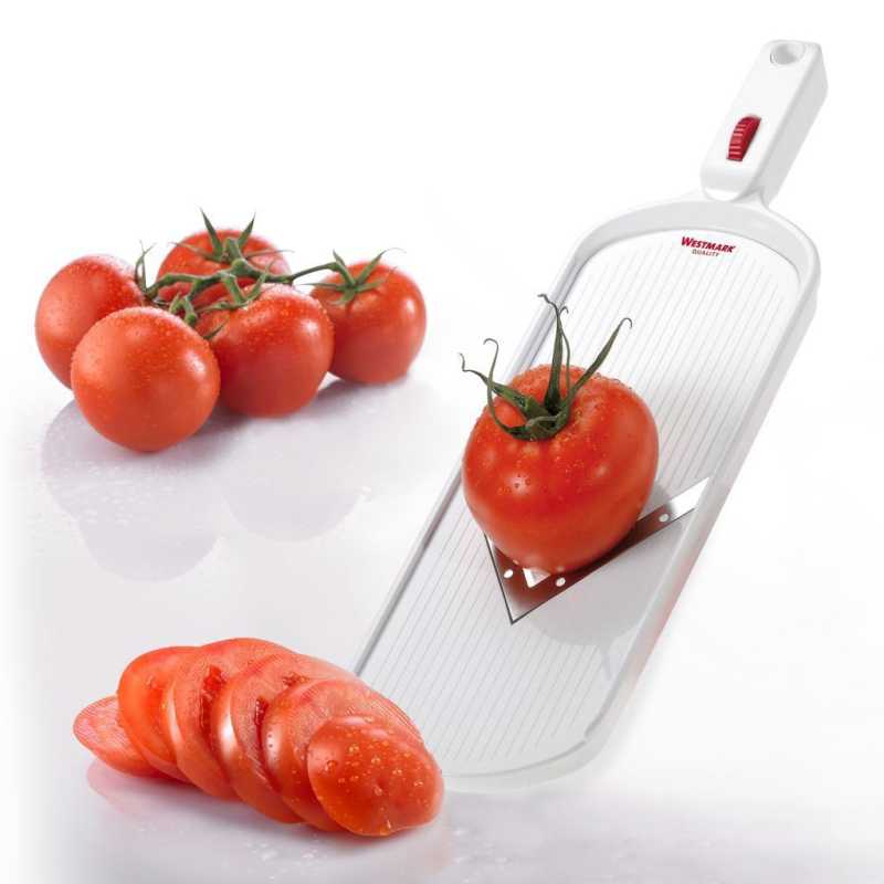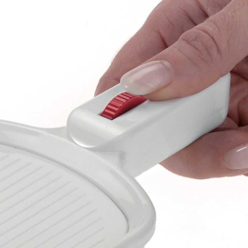 A kiváló minőségű Westmark V-Hobel zöldségszeletelő rozsdamentes acélból készült, nagyon éles, V-alakú pengével rendelkezik és lehetővé teszi a gyümölcsök és zöldségek könnyed, gyors és zajmentes vágását, szeletelését. A szeletek vastagsága állítható a fogantyúban található kerékkel tetszés szerint, 1-3 mm között. A mellékelt törmeléktartó biztosítja a biztonságos, sérülésveszély nélküli vágást.