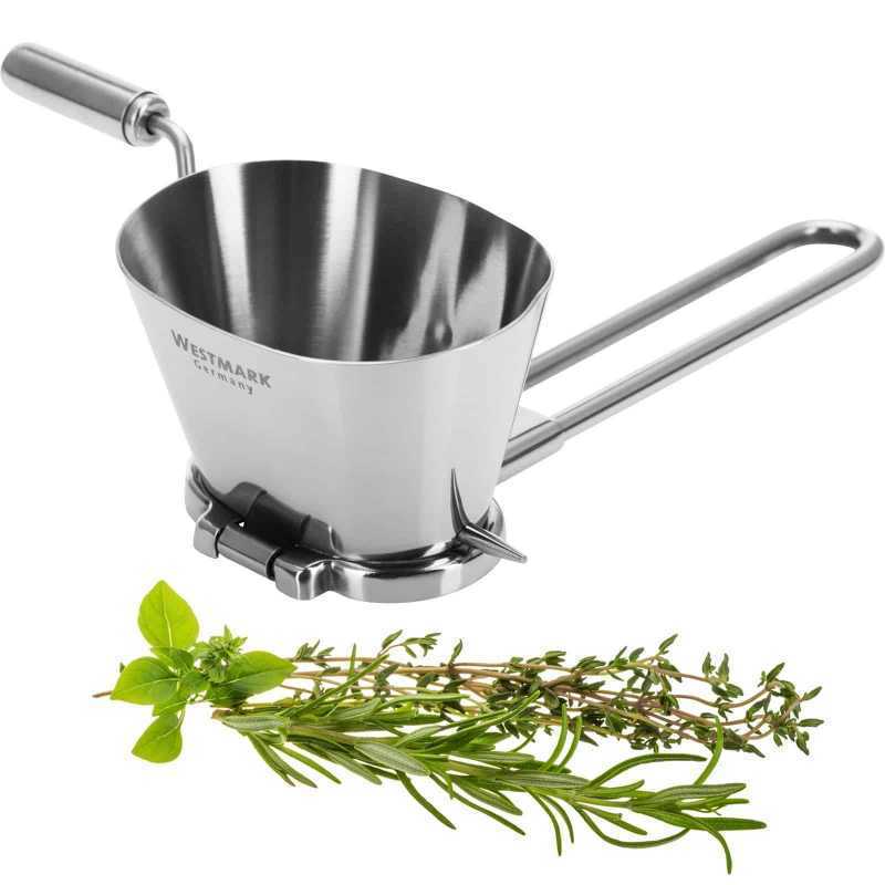 Praktikus, rozsdamentes acélból készült Westmark fűszernövény daráló és aprító villámmgyorsan ledarálja a friss kerti és konyhai fűszernövényeket, például petrezselymet, mentát, zsályát és cseresznyét pácokhoz, szószokhoz és fűszerkeverékekhez. Mivel a fűszernövényeket az éles, forgó vágófogak a daráló belsejébe húzzák a darálandó fűszernövényt, így nincs sérülésveszély a kezelés során. A nagy tölcsér megkönnyíti a darálandó ételek adagolását. Használat után a daráló könnyen szétszerelhető és tisztítható.