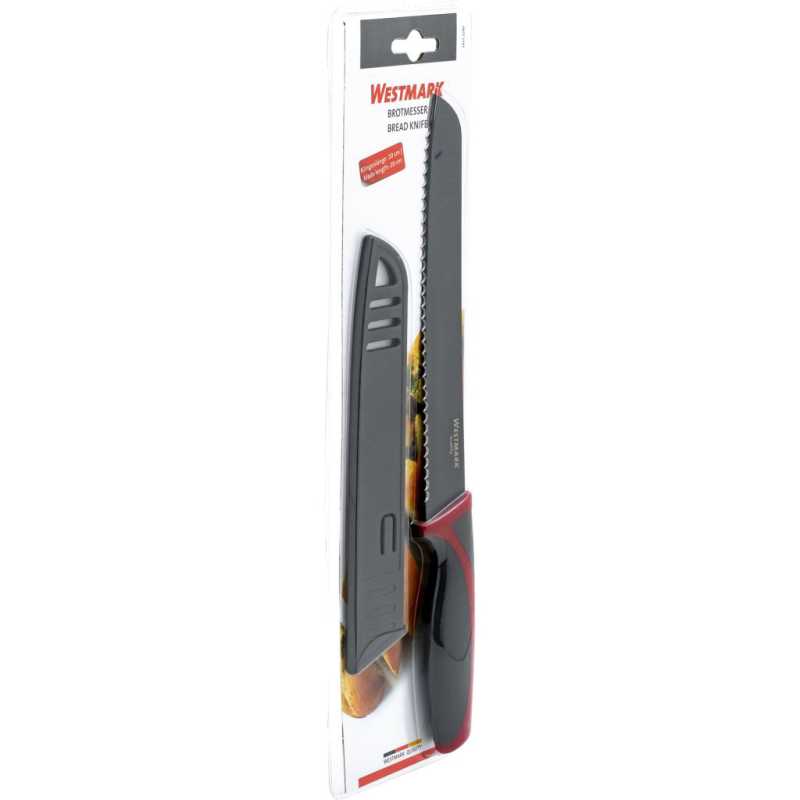 A Westmark kenyérvágó kés rozsdamentes acélból készült, éles, tapadásmentes fogazott pengével rendelkezik és ideális kenyér, zsemle, croissant és egyéb kenyérfélék vágásához, szeleteléséhez. A pengevédőnek köszönhetően a vágóél a fiókban védve van a sérülésektől.