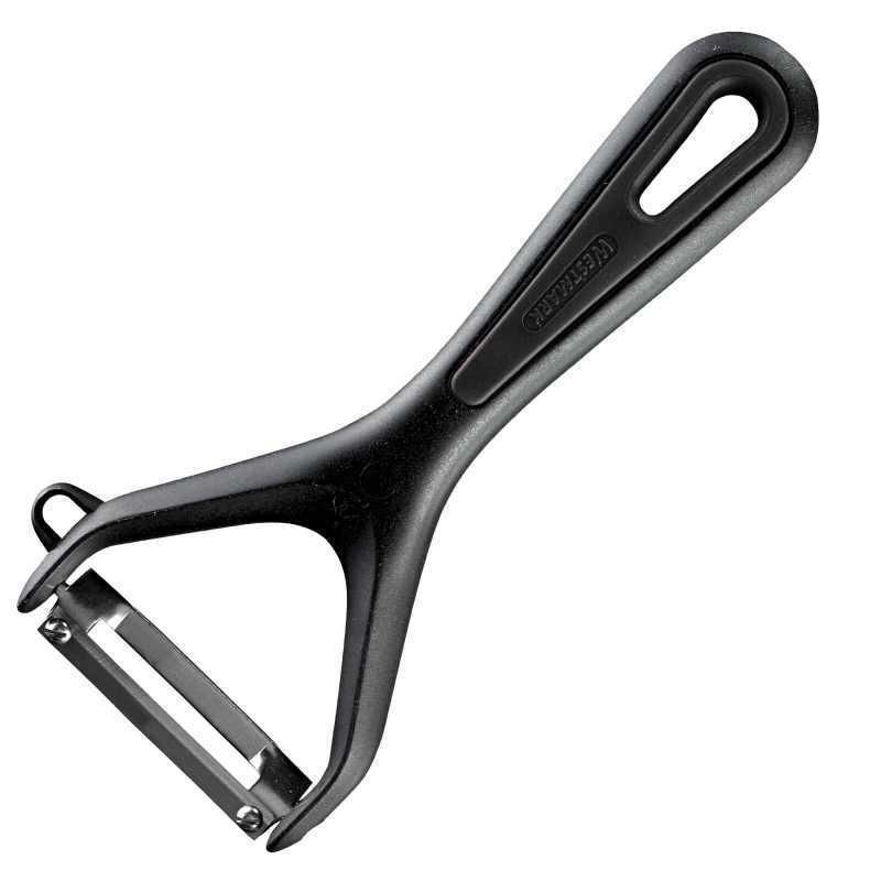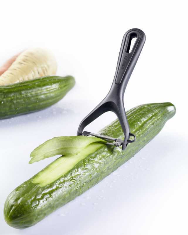 Westmark Gente sorozat zöldséghámozója, minimalista dizájnnal, fekete színben. Rozsdamentes pengéje mozgatható így kiválóan alkalmazkodik mindenféle hámozási felülethez. Alkalmas kerek vagy hosszúkás zöldségek hámozására, mint például kígyóuborka, spárga, burgonya és alma. A penge ezen kívül segít eltávolítani a zöldség sérült részeit. Kényelmesen használható és akasztható, így helytakarékosan tárolható.
