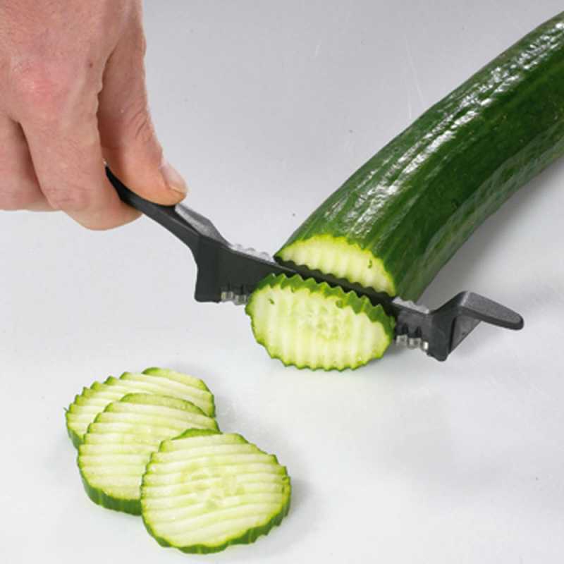 A praktikus Westmark hullámos szeletelővel gyorsan dekoratív hullámvágást adhat a zöldségeknek, gyümölcsöknek vagy sajtoknak. Az éles rozsdamentes acél pengének és a két fogantyúnak köszönhetően különösen könnyű és biztonságos a használata, még a keményebb zöldségekkel is. Varázsoljon egészséges dekorációkat büfékhez vagy házi készítésű zöldségchipset 'ujjételként' a partira.