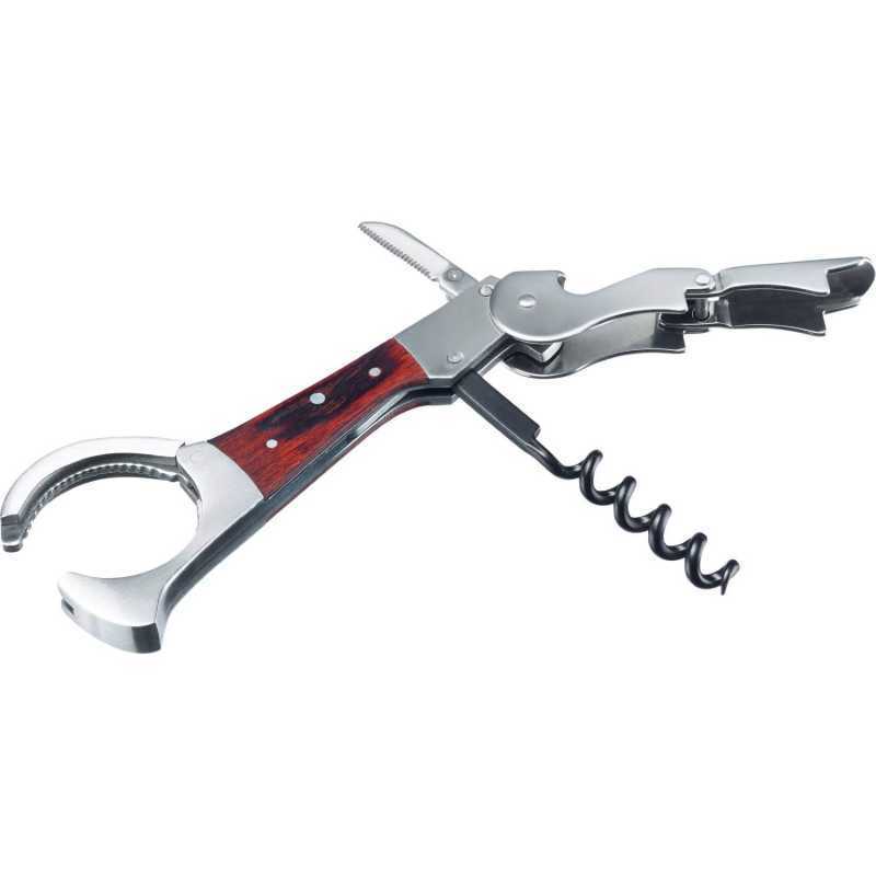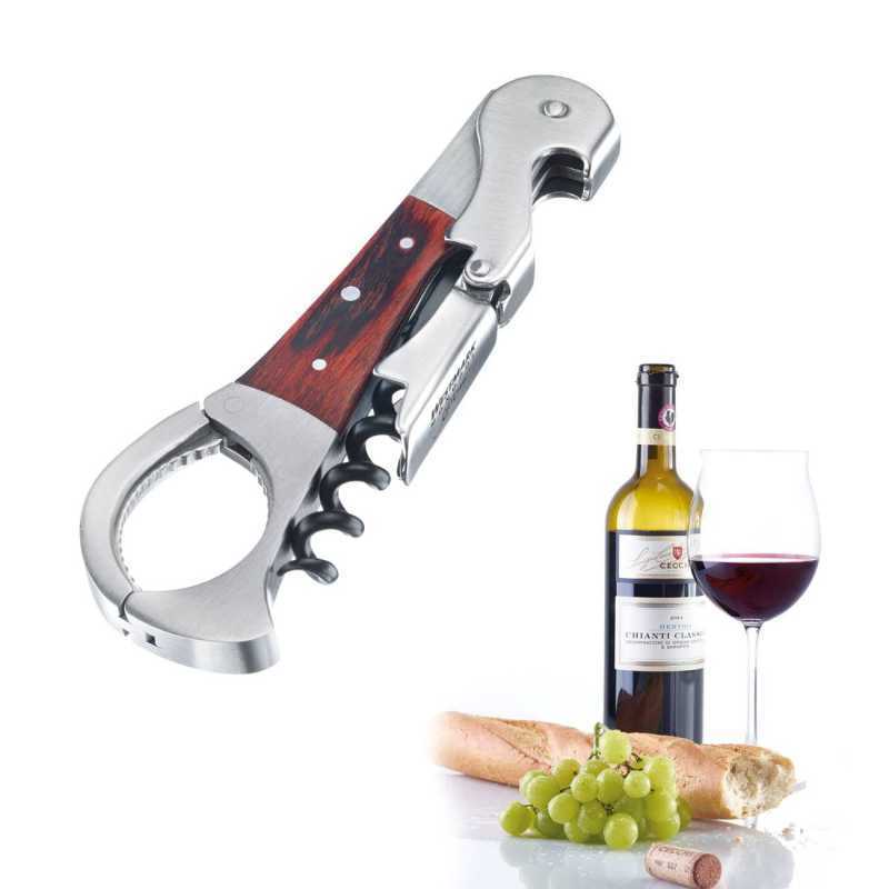 Kiváló minőségű csiszolt rozsdamentes acél, fa fogóval.Fogazott penge, könnyű dugó eltávolítás, üvegnyitó.