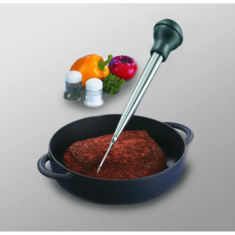 A szett tartalma egy rozsdamentes szívócső, egy szilikon tartály, egy injekciós tű és egy tisztítókefe. A kiváló minőségű Westmark locsolóval könnyedén locsolhatja a sülteket, így a hús garantáltan szaftos marad. A befecskendező tű segítségével könnyedén adhat mártást vagy akár pácot a pecsenyéhez. Ezenkívül a locsoló alkalmas zsír könnyű elválasztására mártásoktól, levesektől. A könnyű adagolásnak köszönhetően nagyon pontos munkát biztosít.