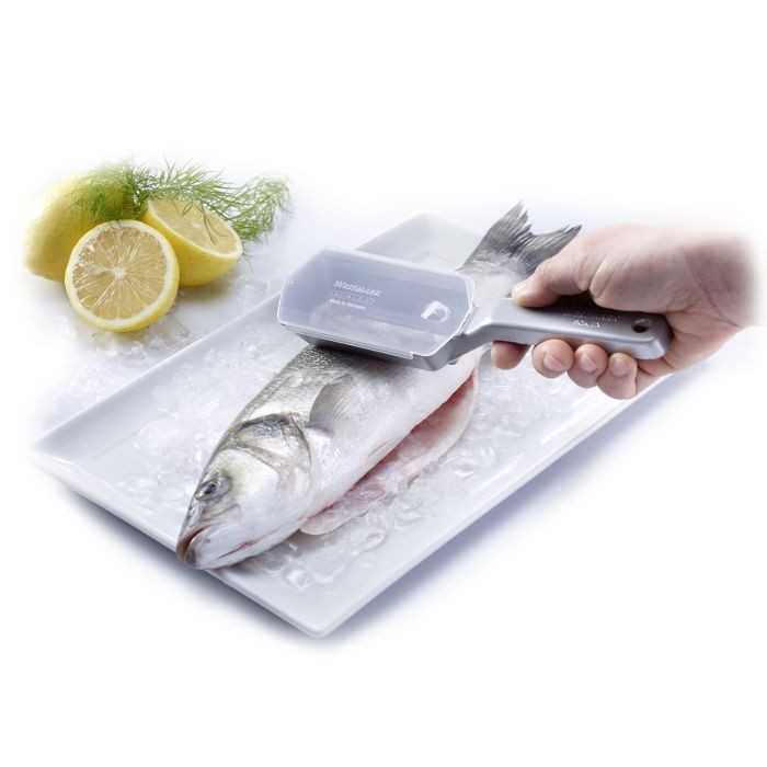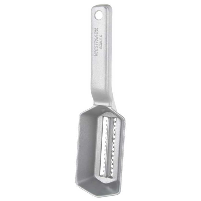A Westmark Scalex halpikkelyező éles rozsdamentes acél pengékkel rendelkezik a halpikkelyek könnyű és gyors eltávolításához. Így hatékonyan és tisztán pucolhat halakat. Egyszerűen húzza a pikkelyezőt a halpikkelyek növekedési irányával szemben. A felcsíptethető gyűjtőtálcának köszönhetően a leválasztott pikkelyek tisztán összegyűlnek, így könnyen tisztán tartható a konyha.